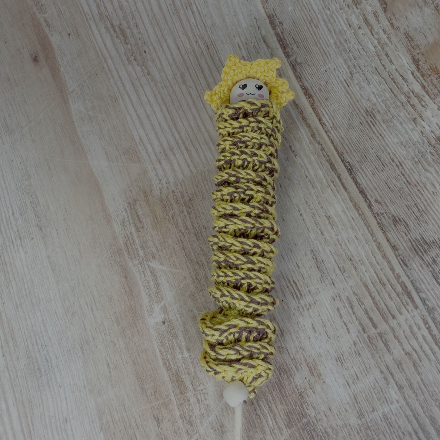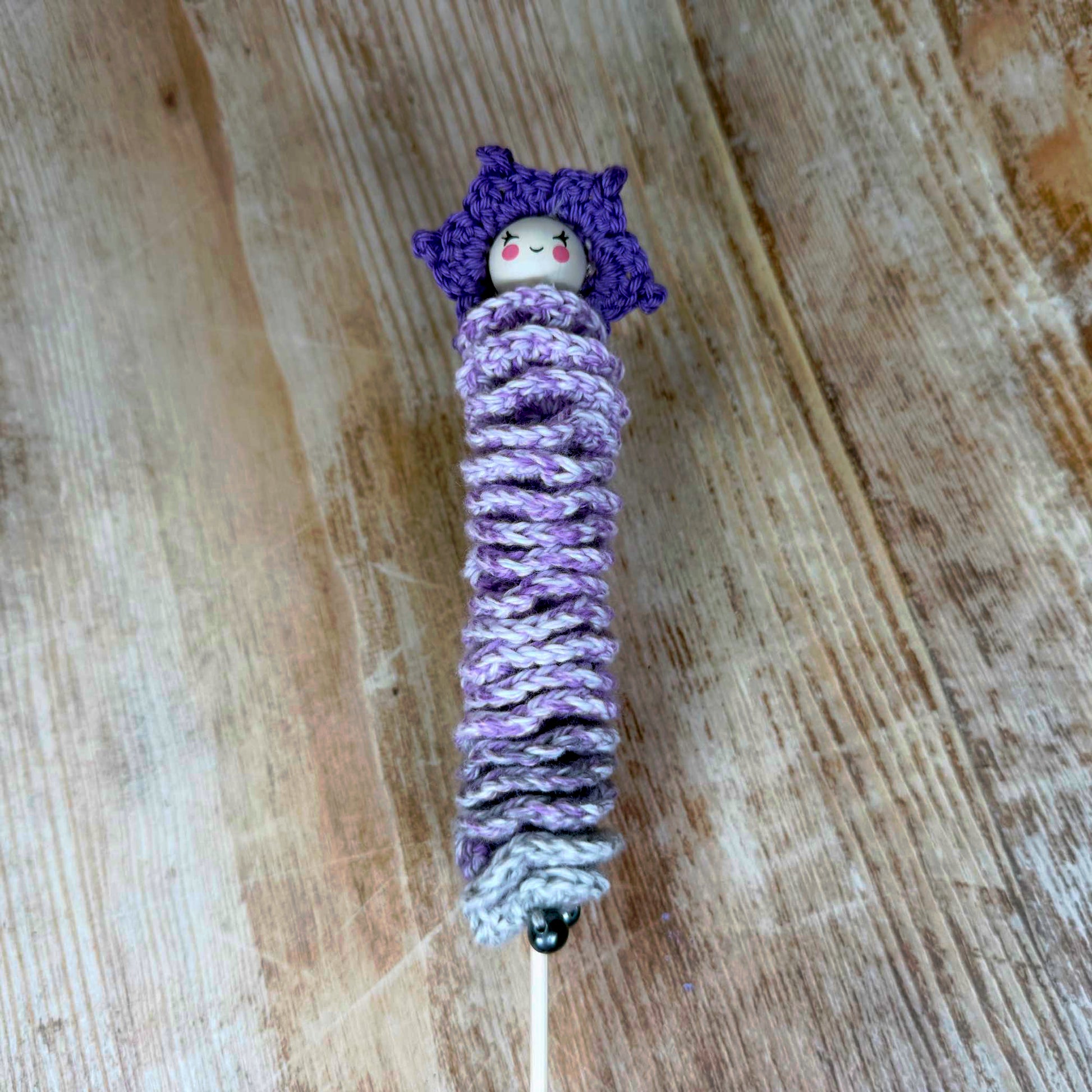 Handgestrickte Blumenstecker mit ausdrucksstarken Gesichtern, die jeder Pflanze Persönlichkeit verleihen.
