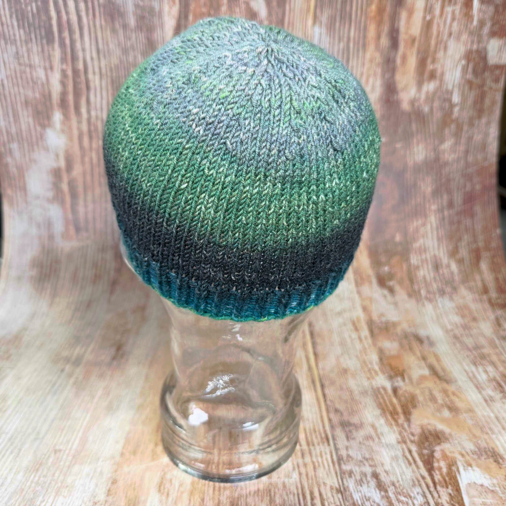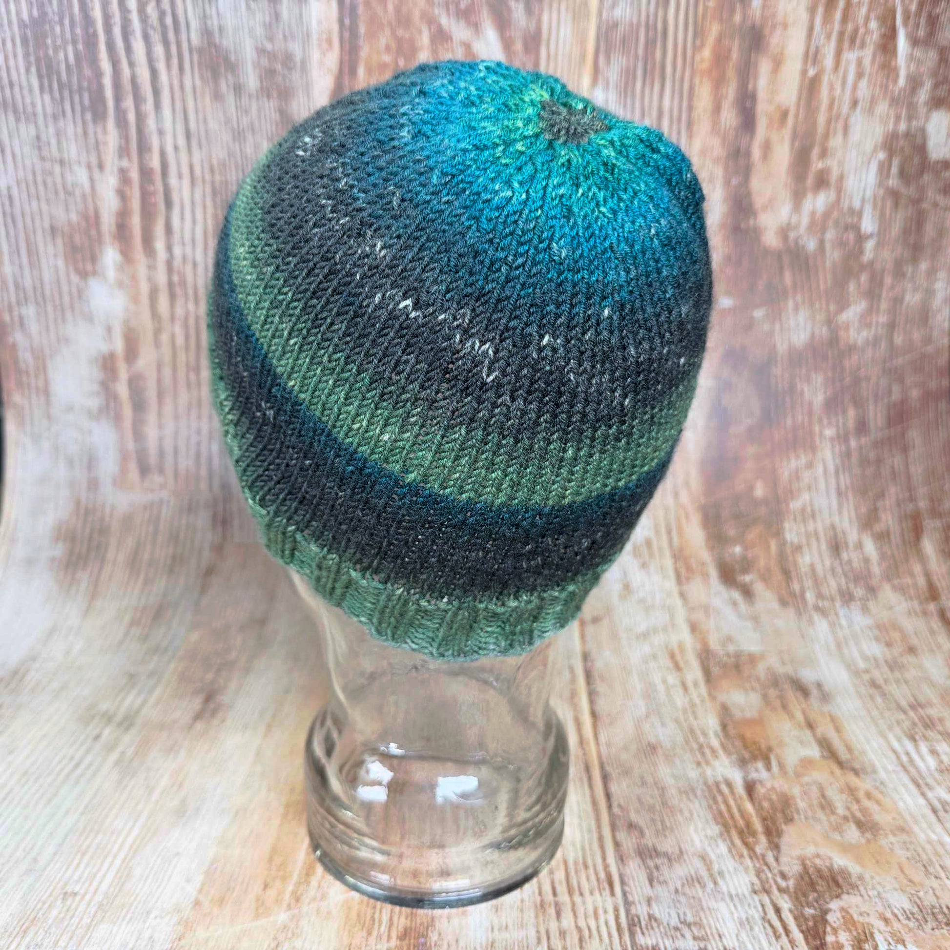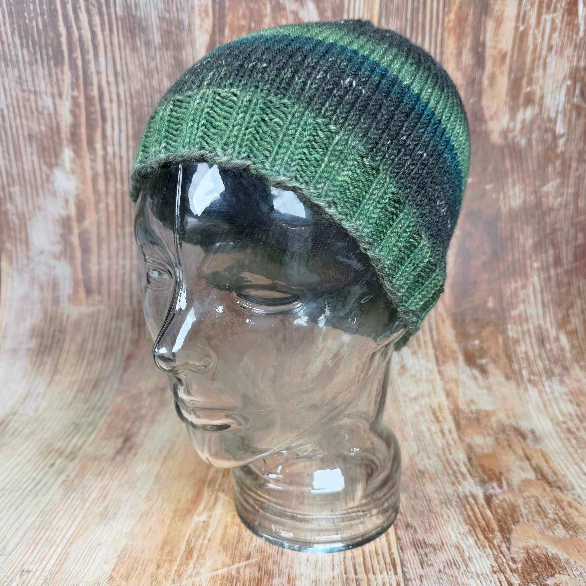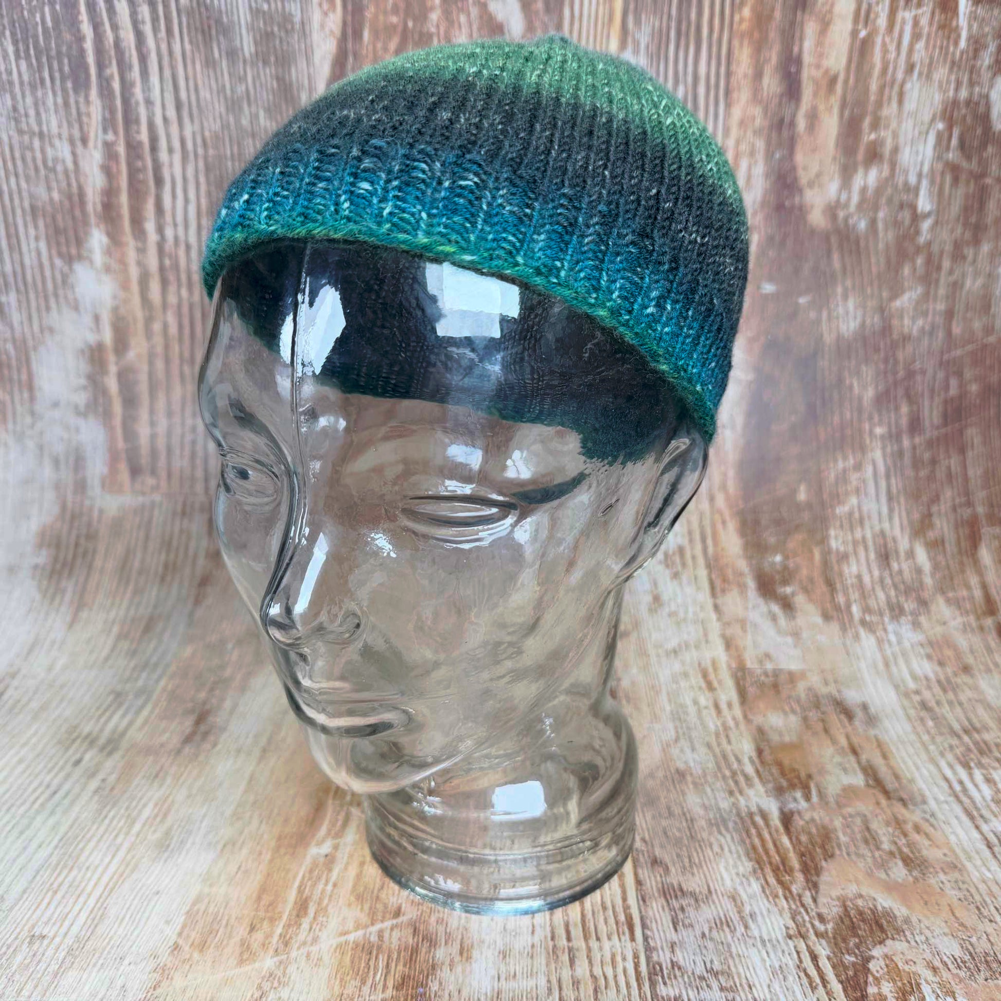 Entdecke unsere handgestrickte Fischermütze, ein charmantes Accessoire mit natürlicher Farbvarianz in Grüntönen.